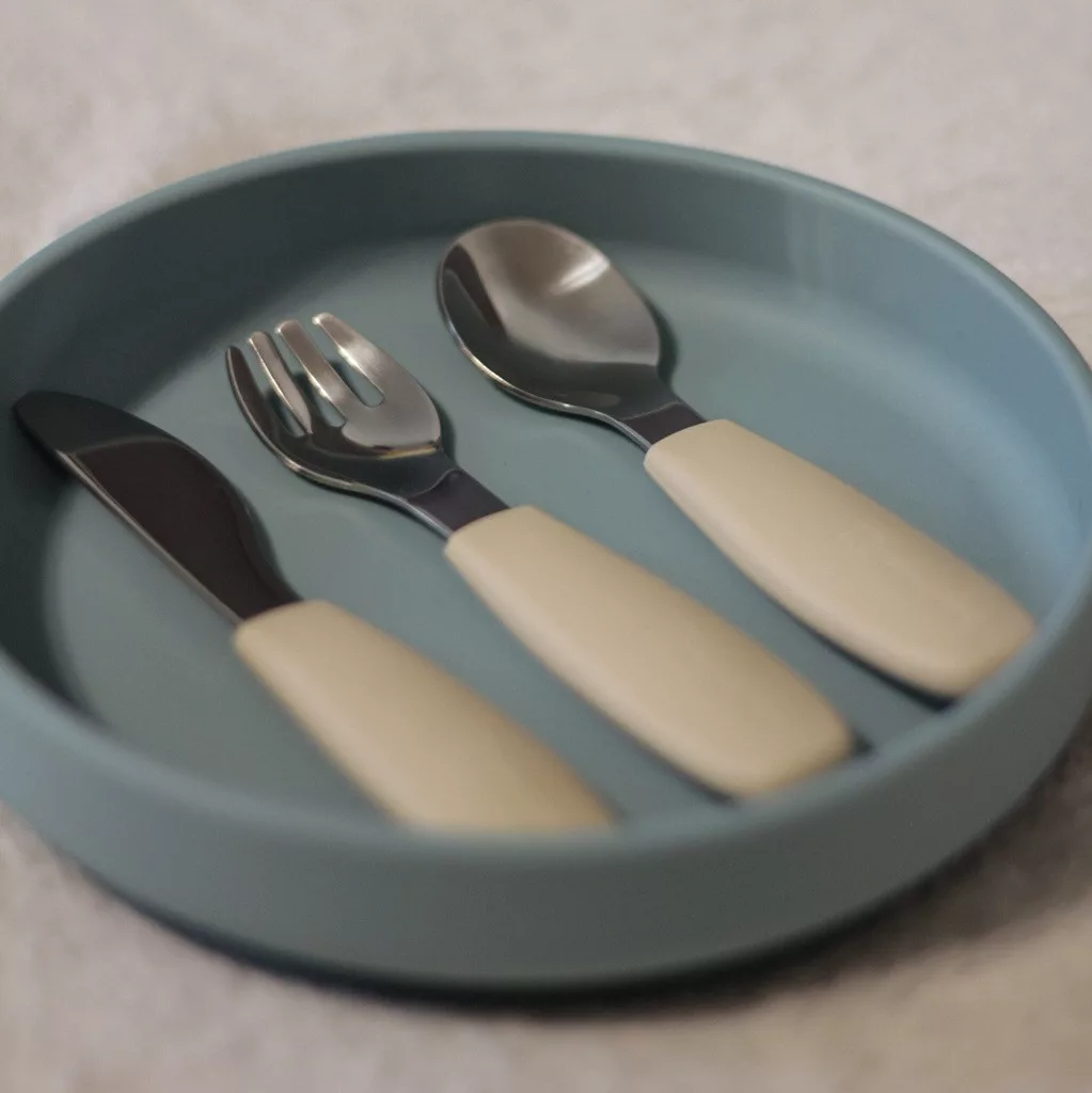 A funkcionális részek kiváló minőségű rozsdamentes acélból készülnek, a fogantyúk ergonomikusak és puha, élelmiszerekkel való érintkezésre alkalmas szilikonnal vannak bevonva - ideális a gyermekkéz számára. Ez kényelmes és biztonságos fogást biztosít, és elősegíti a helyes étkezési szokásokat.