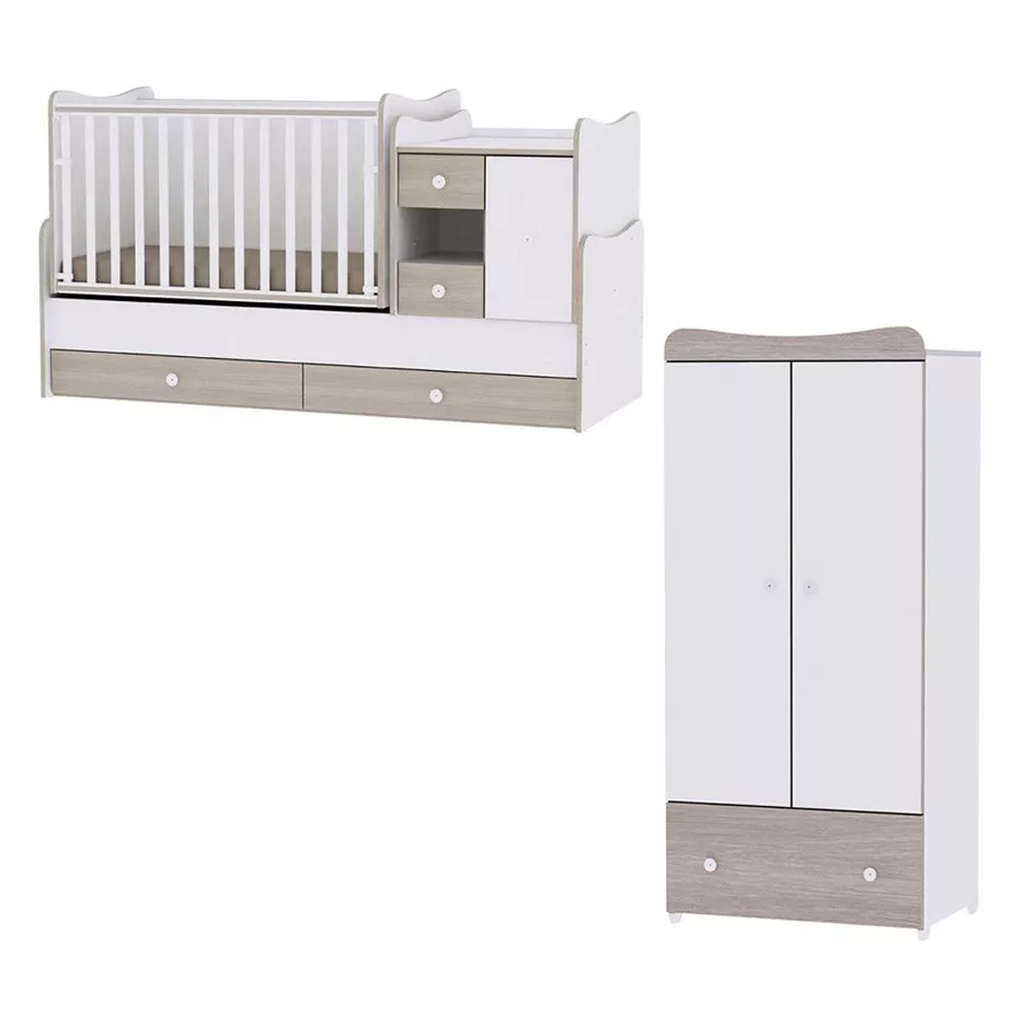 - A kombi ágy egyszerre babaágy és pelenkázó komód, nincs szükség két külön bútordarabra. Amikor a gyereknek már nincs szüksége rácsos kiságyra, a komód és a rácsok levételével egyszerűen átalakítható ifjúsági heverővé és éjjeliszekrénnyé.