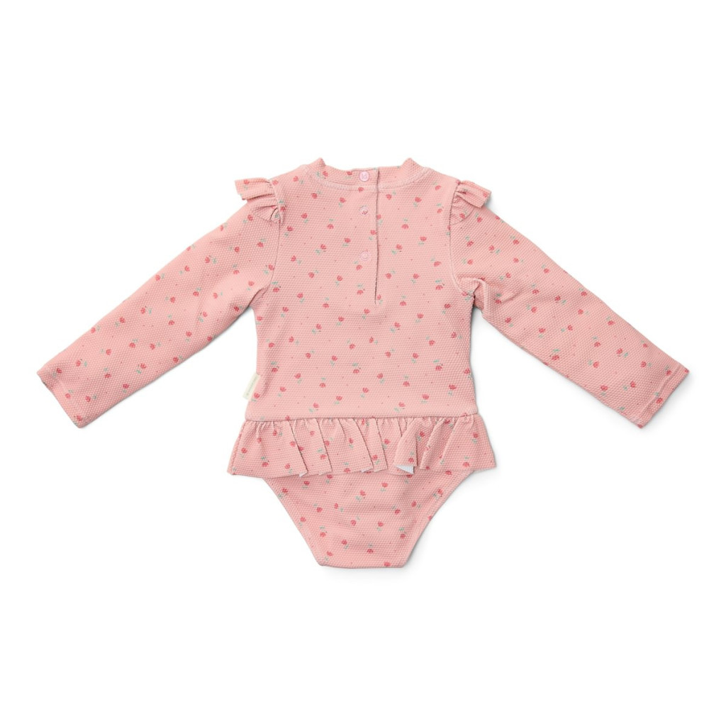 Ez a hosszú ujjú fürdőruha nemcsak gyönyörű, hanem praktikus is: védi babád bőrét a nap sugaraitól, miközben szabadon pancsolhat benne a strandon vagy a medencében. A termék UPF 40+ UV védelemmel rendelkezik.