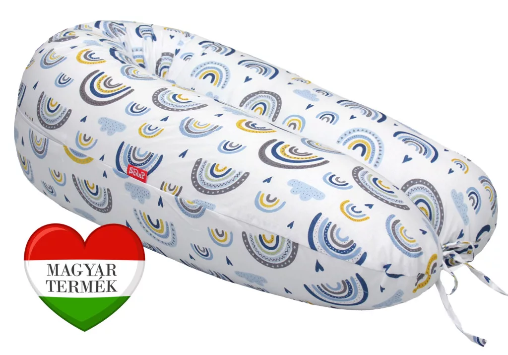 Univerzális szoptatós párna, szivárványos mintával.A Scamp univerzális párna többfunkciós:* Használható a terhesség alatt:* Szoptatáshoz, cumisüveges etetéshez* Használható bölcsőként* Támasztékként kiságyban, játék közbenA párna külső huzata:Méret: 155cm x 30cmAnyaga: Külső huzat: 100% pamutvászon Belső huzat: 100% poliészter Párna töltet: 100% szilikonizált poliészterOEKO-Tex® Standard 100 minősítéssel rendelkezik. A huzat levehető. Két végében kötöző zsinór van, így a párna végeinél összeköthető.A párna töltetének mennyiségét saját tapasztalásunk, és a megkérdezett felhasználók véleménye szerint állapítottuk meg.Ha a párnát kevésbé szeretjük keményen, a töltet mennyisége csökkenthető.A keményebb párnák kedvelői plusz töltetet vásárolhatnak.A párna töltete szilikonizált poliészter.Az aprócska poliészter gombolyagok és a terjedelmesített poliészter szálak olyan töltetet eredményeznek, melyek rendkívüli tulajdonságokkal bírnak: - Csendes! Használat közben nem zsizseg, nem súrlódik a töltet.- Mosógépben mosható! Mosás után a párnát fel kell rázni, a töltetet egalizálni kell!- Antibakteriális. A töltet előállítása során semmilyen vegyszert, antisztatizáló anyagot, festéket... nem használtak! - Nagyon jól formázható mind vastagságban/átmérőben, mind pedig alakjában.Tetszésünk szerint a legkényelmesebb formára alakítható.