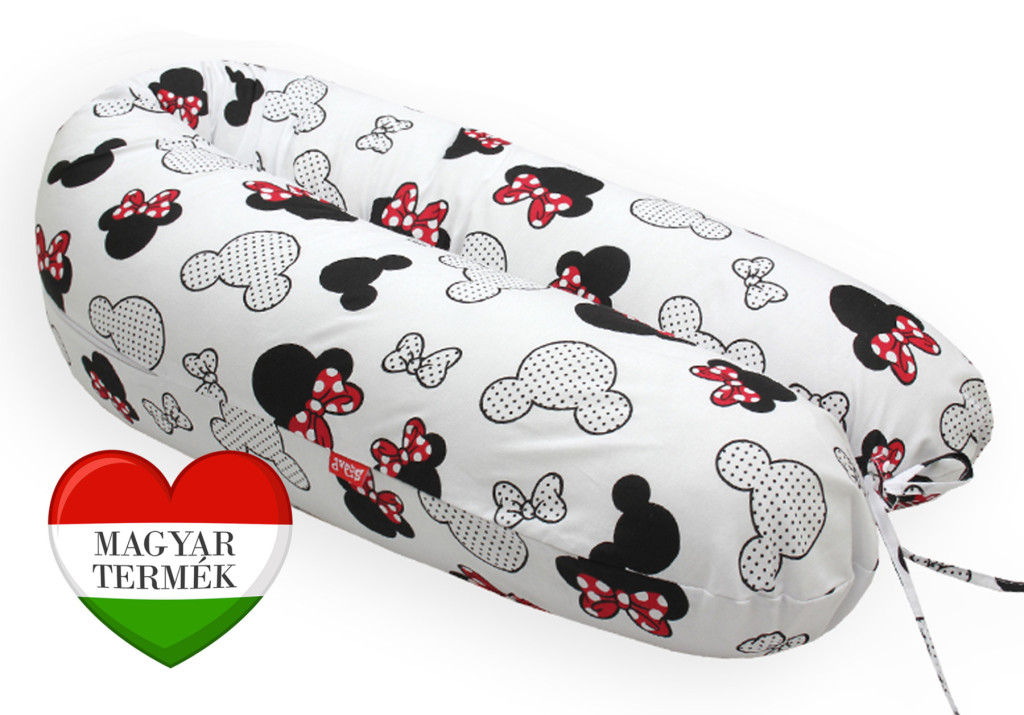 Univerzális szoptatós párna, egeres sziluett mintával.A Scamp univerzális párna többfunkciós:* Használható a terhesség alatt:* Szoptatáshoz, cumisüveges etetéshez* Használható bölcsőként* Támasztékként kiságyban, játék közbenA párna külső huzata:Méret: 155cm x 30cmAnyaga: Külső huzat: 100% pamutvászon Belső huzat: 100% poliészter Párna töltet: 100% szilikonizált poliészterOEKO-Tex® Standard 100 minősítéssel rendelkezik. A huzat levehető. Két végében kötöző zsinór van, így a párna végeinél összeköthető.A párna töltetének mennyiségét saját tapasztalásunk, és a megkérdezett felhasználók véleménye szerint állapítottuk meg.Ha a párnát kevésbé szeretjük keményen, a töltet mennyisége csökkenthető.A keményebb párnák kedvelői plusz töltetet vásárolhatnak.A párna töltete szilikonizált poliészter.Az aprócska poliészter gombolyagok és a terjedelmesített poliészter szálak olyan töltetet eredményeznek, melyek rendkívüli tulajdonságokkal bírnak: - Csendes! Használat közben nem zsizseg, nem súrlódik a töltet.- Mosógépben mosható! Mosás után a párnát fel kell rázni, a töltetet egalizálni kell!- Antibakteriális. A töltet előállítása során semmilyen vegyszert, antisztatizáló anyagot, festéket... nem használtak! - Nagyon jól formázható mind vastagságban/átmérőben, mind pedig alakjában.Tetszésünk szerint a legkényelmesebb formára alakítható.